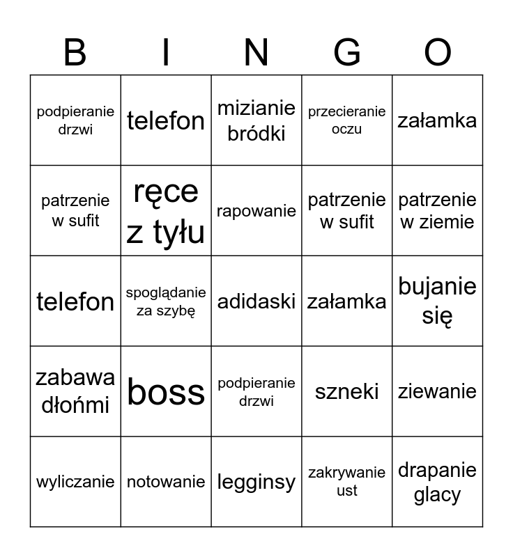 This bingo card has 25 words: boss, legginsy, rapowanie, wyliczanie, załamka, podpieranie drzwi, patrzenie w sufit, telefon, załamka, podpieranie drzwi, patrzenie w sufit, telefon, szneki, ziewanie, ręce z tyłu, drapanie glacy, bujanie się, mizianie bródki, patrzenie w ziemie, spoglądanie za szybę, adidaski, notowanie, zabawa dłońmi, przecieranie oczu and zakrywanie ust.