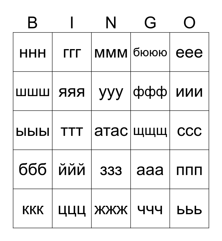 This bingo card has a free space and 24 words: ййй, ццц, ууу, ккк, еее, ннн, шшш, ггг, щщщ, ззз, ффф, ыыы, ааа, ппп, яяя, ччч, ссс, ммм, иии, ттт, ььь, ббб, бююю and жжж.