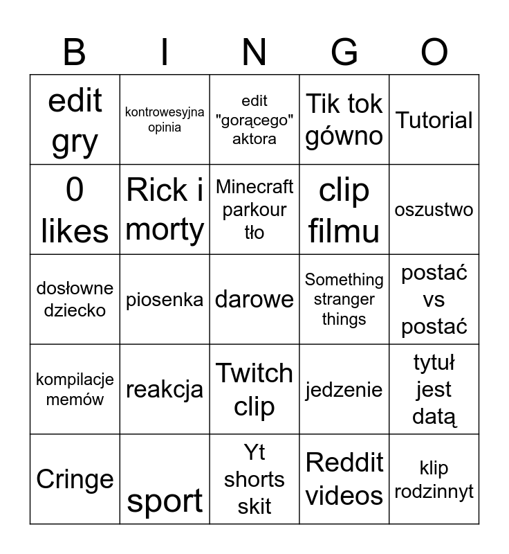 This bingo card has a free space and 24 words: reakcja, sport, Minecraft parkour tło, Cringe, Tutorial, edit gry, 0 likes, kontrowesyjna opinia, Something stranger things, Twitch clip, clip filmu, dosłowne dziecko, jedzenie, tytuł jest datą, Rick i morty, Reddit videos, postać vs postać, edit "gorącego" aktora, oszustwo, piosenka, klip rodzinnyt, kompilacje memów, Tik tok gówno and Yt shorts skit.