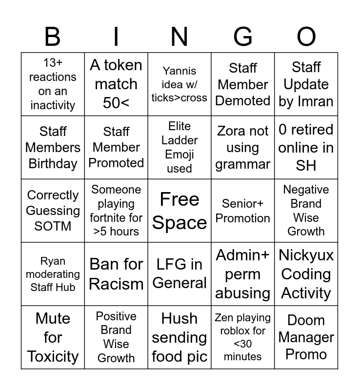 This bingo card has a free space and 24 words: Ban for Racism, Positive Brand Wise Growth, Elite Ladder Emoji used, Mute for Toxicity, Staff Update by Imran, 13+ reactions on an inactivity, Staff Members Birthday, A token match 50<, Senior+ Promotion, LFG in General, Zora not using grammar, Correctly Guessing SOTM, Admin+ perm abusing, Nickyux Coding Activity, Staff Member Promoted, Zen playing roblox for <30 minutes, Negative Brand Wise Growth, Yannis idea w/ ticks>cross, 0 retired online in SH, Someone playing fortnite for >5 hours, Doom Manager Promo, Ryan moderating Staff Hub, Staff Member Demoted and Hush sending food pic.