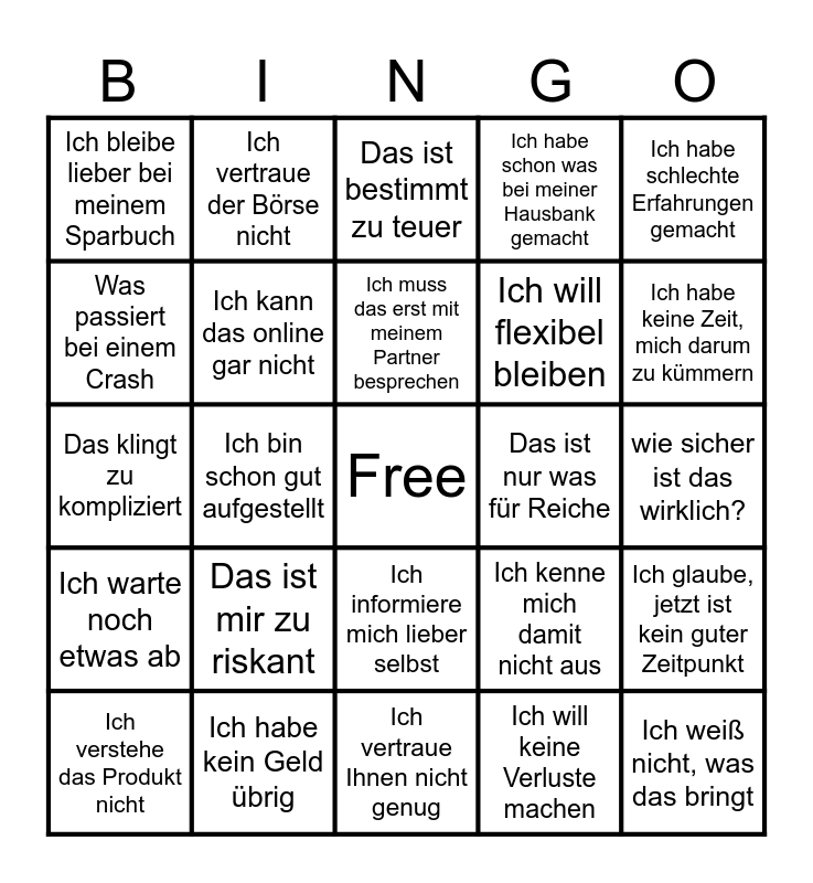 This bingo card has a free space and 24 words: Das ist mir zu riskant, Ich habe kein Geld übrig, Ich muss das erst mit meinem Partner besprechen, Ich verstehe das Produkt nicht, Ich habe schlechte Erfahrungen gemacht, Ich bleibe lieber bei meinem Sparbuch, Was passiert bei einem Crash, Ich vertraue der Börse nicht, Das ist nur was für Reiche, Ich informiere mich lieber selbst, Ich will flexibel bleiben, Das klingt zu kompliziert, Ich kenne mich damit nicht aus, Ich glaube, jetzt ist kein guter Zeitpunkt, Ich kann das online gar nicht, Ich will keine Verluste machen, wie sicher ist das wirklich?, Das ist bestimmt zu teuer, Ich habe keine Zeit, mich darum zu kümmern, Ich bin schon gut aufgestellt, Ich weiß nicht, was das bringt, Ich warte noch etwas ab, Ich habe schon was bei meiner Hausbank gemacht and Ich vertraue Ihnen nicht genug.