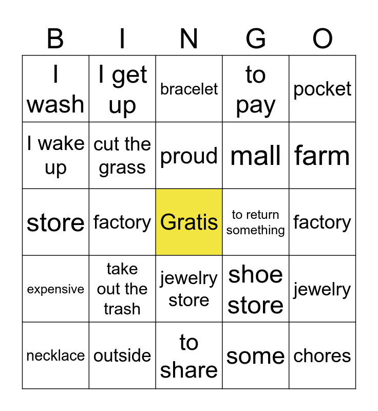 This bingo card has a free space and 26 words: jewelry store, some, proud, outside, pocket, I wash, I wake up, I get up, factory, shoe store, mall, store, jewelry, necklace, factory, to buy, to pay, expensive, bracelet, chores, farm, to share, to return something, take out the trash, cut the grass and vacuum.
