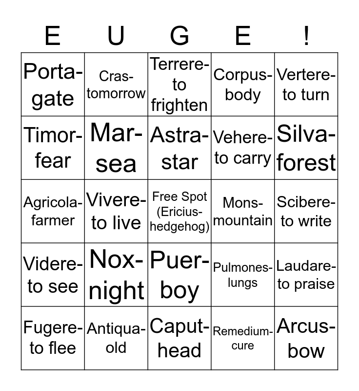 This bingo card has a free space and 41 words: Amicus- friend, Agricola- farmer, Edere- to eat, Mar- sea, Antiqua- old, Puer- boy, Astra- star, Tergere- to clean/wipe, Vertere- to turn, Videre- to see, Vivere- to live, Corpus- body, Arcus- bow, Scibere- to write, Mons- mountain, Nox- night, Satis- enough, Porta- gate, Ira- anger, Terrere- to frighten, Laudare- to praise, Periculum- danger, Caput- head, Vehere- to carry, Veritas- truth, Dona- gift, Remedium- cure, Vestigia- print, trace., Silva- forest, Audire- to hear, Vacuus- empty, Cras- tomorrow, Fugere- to flee, Vulnere- to wound, Pulmones- lungs, Timor- fear, Civitas- state, Liber- book, Cogere- to think, Sentire- to feel and Necare- to kill.
