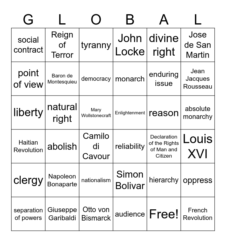 This bingo card has 41 words: audience, enduring issue, historical context, point of view, reliability, absolute monarchy, Baron de Montesquieu, consent, divine right, Enlightenment, Jean Jacques Rousseau, John Locke, liberty, Mary Wollstonecraft, natural right, reason, separation of powers, social contract, Free!, tyranny, abolish, clergy, Declaration of the Rights of Man and Citizen, democracy, French Revolution, hierarchy, Louis XVI, Robespierre, monarch, Napoleon Bonaparte, peasant, Reign of Terror, Camilo di Cavour, Giuseppe Garibaldi, Haitian Revolution, Jose de San Martin, nationalism, oppress, Otto von Bismarck, Simon Bolivar and Toussaint L'Ouverture.