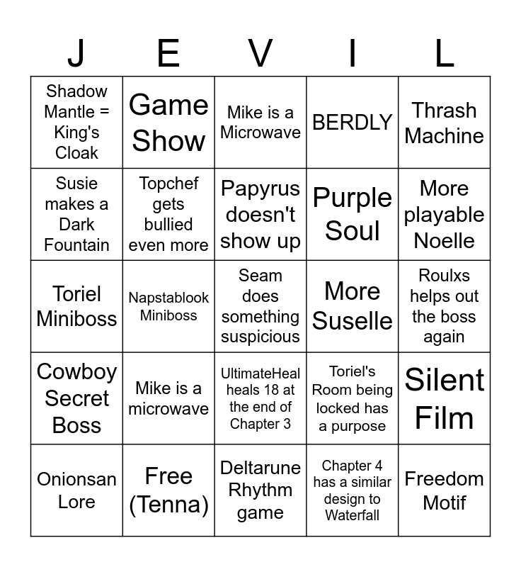 This bingo card has 28 words: Silent Film, Proof for 7 knights, Purple Soul, Chapter 4 has a similar design to Waterfall, Susie makes a Dark Fountain, Mike is a Microwave, Game Show, Cowboy Secret Boss, More Suselle, Onionsan Lore, Toriel Miniboss, BERDLY, Free (Tenna), Deltarune Rhythm game, More playable Noelle, Ralsei does something suspicious, Mike is a microwave, Topchef gets bullied even more, Papyrus doesn't show up, UltimateHeal heals 18 at the end of Chapter 3, Shadow Mantle = King's Cloak, Freedom Motif, Seam does something suspicious, Napstablook Miniboss, Roulxs helps out the boss again, Toriel's Room being locked has a purpose, Thrash Machine and Secret boss item is a hat.