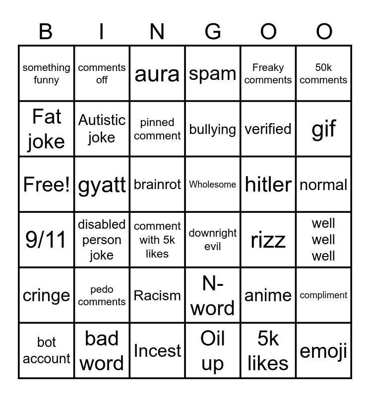This bingo card has 36 words: N-word, Racism, Oil up, Fat joke, 9/11, Wholesome, Autistic joke, Incest, Freaky comments, anime, gif, spam, compliment, gyatt, bullying, something funny, cringe, hitler, Free!, aura, brainrot, disabled person joke, downright evil, comment with 5k likes, rizz, comments off, verified, bad word, pinned comment, 50k comments, emoji, bot account, well well well, normal, pedo comments and 5k likes.