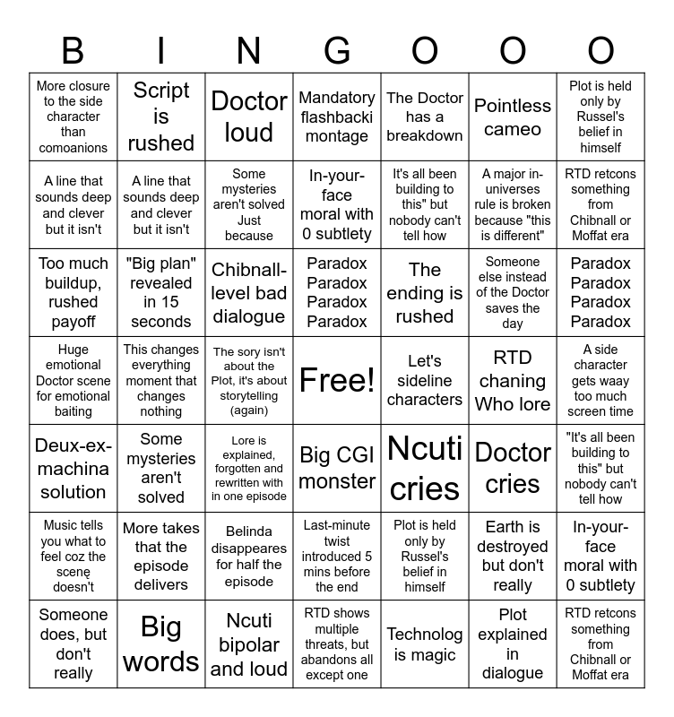 This bingo card has a free space and 74 words: Doctor regenerates, Doctor cries, Doctor loud, Belinda disappeares for half the episode, Too much buildup, rushed payoff, Last-minute twist introduced 5 mins before the end, Big CGI monster, Plot explained in dialogue, Paradox Paradox Paradox Paradox, Deux-ex-machina solution, RTD chaning Who lore, Someone else instead of the Doctor saves the day, A line that sounds deep and clever but it isn't, Pointless cameo, "Big plan" revealed in 15 seconds, It's all been building to this" but nobody can't tell how, RTD retcons something from Chibnall or Moffat era, Some mysteries aren't solved Just because, The real Plot start 20 minutes in, In-your-face moral with 0 subtlety, Plot is held only by Russel's belief in himself, Script is rushed, Mandatory flashbacki montage, A side character gets waay too much screen time, A major in-universes rule is broken because "this is different", Big words, Earth is destroyed but don't really, Someone does, but don't really, Nostalgia baiting, Technolog is magic, The Doctor has a breakdown, Scenę exists just to show budget, It's a trailer for a spinoff!, Episode feels like 3 scripts glued together, Lore is explained, forgotten and rewritten with in one episode, The sory isn't about the Plot, it's about storytelling (again), Story logic died in first 10 minutes, Info-duping at its finest, More takes that the episode delivers, Music tells you what to feel coz the scenę doesn't, This changes everything moment that changes nothing, Huge emotional Doctor scene for emotional baiting, RTD shows multiple threats, but abandons all except one, Random Reddit theory was 10 Times better than this, 'Stories', 'Family' or 'Home' repeated 5 times, More closure to the side character than comoanions, Let's sideline characters, Chibnall-level bad dialogue, Doctor regenerates, Ncuti cries, Ncuti bipolar and loud, Belinda disappeares for half the episode, Too much buildup, rushed payoff, Last-minute twist introduced 5 mins before the end, Big CGI monster, Plot explained in dialogue, Paradox Paradox Paradox Paradox, Deux-ex-machina solution, RTD chaning Who lore, Someone else instead of the Doctor saves the day, A line that sounds deep and clever but it isn't, Pointless cameo, "Big plan" revealed in 15 seconds, "It's all been building to this" but nobody can't tell how, RTD retcons something from Chibnall or Moffat era, Some mysteries aren't solved, The real Plot start 20 minutes in, In-your-face moral with 0 subtlety, The ending is rushed, Plot is held only by Russel's belief in himself, Mandatory flashbag montage, Belinda's arc is rushed in one speech, A side charakter gets waay too much screen time and A major in-universes rule is broken because "this is different".