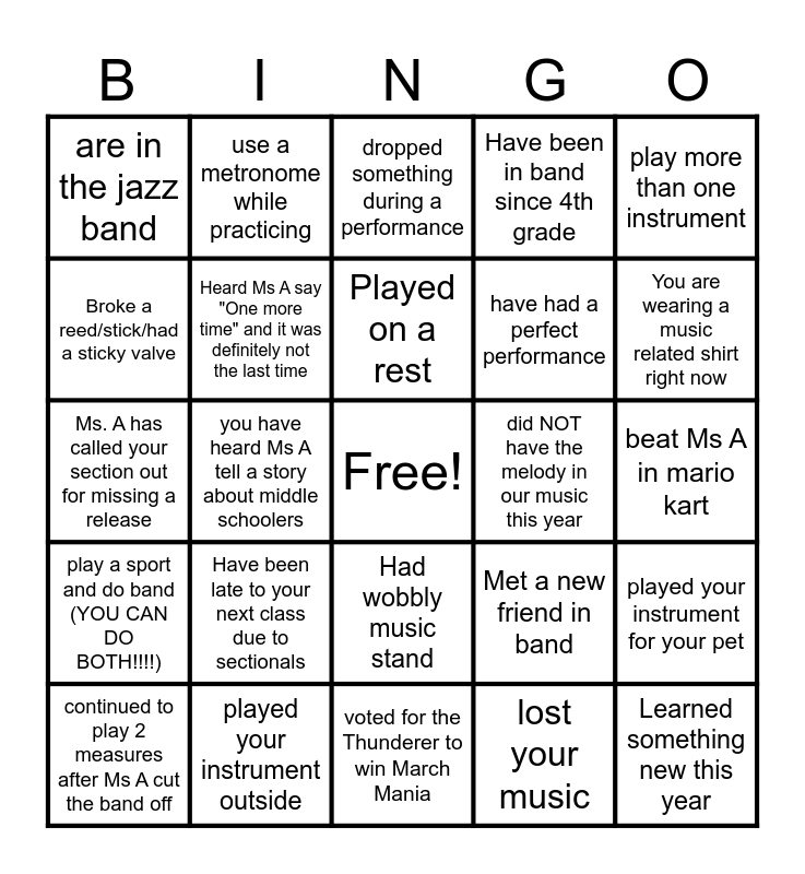 This bingo card has a free space and 24 words: Have been late to your next class due to sectionals, played your instrument outside, Played on a rest, continued to play 2 measures after Ms A cut the band off, play more than one instrument, are in the jazz band, Broke a reed/stick/had a sticky valve, use a metronome while practicing, did NOT have the melody in our music this year, Had wobbly music stand, have had a perfect performance, Ms. A has called your section out for missing a release, Met a new friend in band, played your instrument for your pet, Heard Ms A say "One more time" and it was definitely not the last time, lost your music, beat Ms A in mario kart, dropped something during a performance, You are wearing a music related shirt right now, you have heard Ms A tell a story about middle schoolers, Learned something new this year, play a sport and do band (YOU CAN DO BOTH!!!!), Have been in band since 4th grade and voted for the Thunderer to win March Mania.