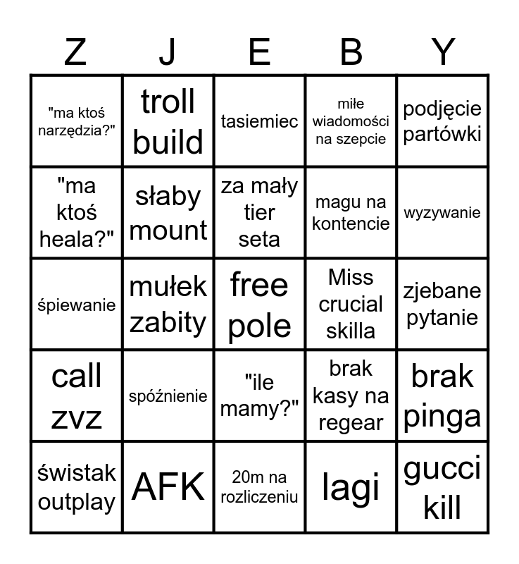 This bingo card has a free space and 36 words: multi target call, congo na vc, 1v1, słaby mount, brak kasy na regear, call zvz, za mały tier seta, wipe, podjęcie partówki, ragequit, mułek zabity, miłe wiadomości na szepcie, wpierdalanie w staticka/terke /campa, Miss crucial skilla, wyzywanie, "ma ktoś narzędzia?", dive dunga, spóźnienie, gucci kill, tasiemiec, zjebane pytanie, brak pinga, AFK, świstak outplay, 20m na rozliczeniu, troll build, śpiewanie, brak fooda, magu na kontencie, "ma ktoś heala?", "disband?", przeciążenie, lagi, "ile mamy?", outplay targetu and śmieciowy call.