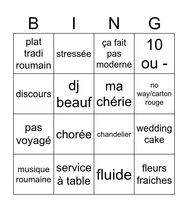 This bingo card has 16 words: service à table, wedding cake, ça fait pas moderne, plat tradi roumain, pas voyagé, stressée, chandelier, fluide, discours, dj beauf, musique roumaine, 10 ou -, chorée, no way/carton rouge, ma chérie and fleurs fraiches.