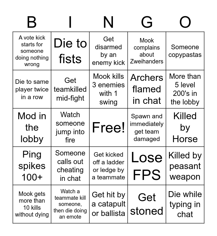 This bingo card has a free space and 30 words: Watch a teammate kill someone, then die doing an emote, See a horse launch into the sky, Watch someone jump into fire, Ragdoll bugs out, A vote kick starts for someone doing nothing wrong, Get disarmed by an enemy kick, Get teamkilled mid-fight, Get kicked off a ladder or ledge by a teammate, Spawn and immediately get team damaged, Get hit by a catapult or ballista, Killed by Horse, Die while typing in chat, Get stoned, Two Team Mates fighting eachother, More than 5 level 200's in the lobby, Player in Weapon select screen, Lose FPS, Ping spikes 100+, Someone calls out cheating in chat, Someone copypastas, Mod in the lobby, Player gets kicked from server, Die to fists, Archers flamed in chat, Die to same player twice in a row, Mook complains about Zweihanders, Killed by peasant weapon, Mook gets more than 10 kills without dying, Mook kills 3 enemies with 1 swing and TK by archer.
