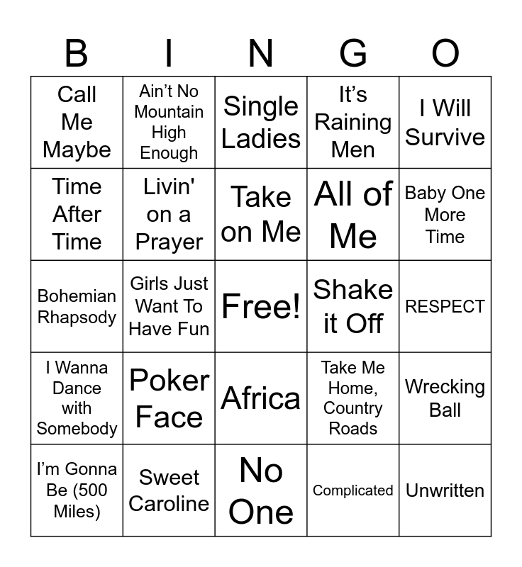 This bingo card has 41 words: Eye of the Tiger, Bohemian Rhapsody, Don't Stop Believin, Livin' on a Prayer, Sweet Caroline, Africa, Take on Me, Dancing Queen, I Will Survive, I Wanna Dance with Somebody, Girls Just Want To Have Fun, It’s Raining Men, Free!, RESPECT, Shake it Off, Poker Face, Uptown Funk, Call Me Maybe, Bad Romance, Single Ladies, Wrecking Ball, Unwritten, No One, All of Me, Mr. Brightside, Since U Been Gone, Complicated, I Want it That Way, Baby One More Time, I Gotta Feeling, Come On Eileen, Ain’t No Mountain High Enough, I’m Gonna Be (500 Miles), Hey Ya!, Take Me Home, Country Roads, Time After Time, You’re the One That I Want, I’m Still Standing, You Give Love a Bad Name, Sk8er Boi and Tennessee Whiskey.