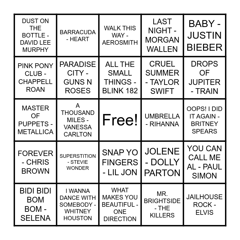 This bingo card has a free space and 29 words: BIDI BIDI BOM BOM - SELENA, ESPRESSO - SABRINA CARPENTER, A THOUSAND MILES - VANESSA CARLTON, ALL MY EX'S LIVE IN TEXAS - GEORGE STRAIT, DUST ON THE BOTTLE - DAVID LEE MURPHY, WALK THIS WAY - AEROSMITH, PARADISE CITY - GUNS N ROSES, SUPERSTITION - STEVIE WONDER, UMBRELLA - RIHANNA, I WANNA DANCE WITH SOMEBODY - WHITNEY HOUSTON, OOPS! I DID IT AGAIN - BRITNEY SPEARS, JAILHOUSE ROCK - ELVIS, WHAT MAKES YOU BEAUTIFUL - ONE DIRECTION, MR. BRIGHTSIDE - THE KILLERS, DROPS OF JUPITER - TRAIN, YOU'RE THE ONE THAT I WANT - GREASE, SNAP YO FINGERS - LIL JON, FOREVER - CHRIS BROWN, BABY - JUSTIN BIEBER, MASTER OF PUPPETS - METALLICA, JOLENE - DOLLY PARTON, RESPECT - ARETHA FRANKLIN, CRUEL SUMMER - TAYLOR SWIFT, PINK PONY CLUB - CHAPPELL ROAN, LAST NIGHT - MORGAN WALLEN, BARRACUDA - HEART, YOU CAN CALL ME AL - PAUL SIMON, ALL THE SMALL THINGS - BLINK 182 and BLACK AND YELLOW - WIZ KHALIFA.