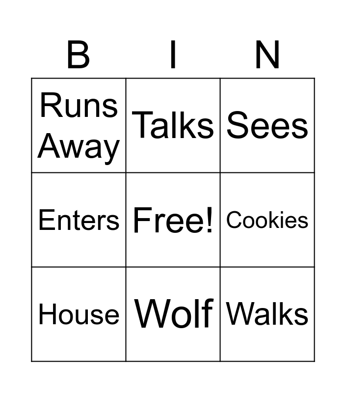 This bingo card has a free space and 11 words: Grandmother, Wolf, Walks, House, Talks, Sees, Cookies, Steals, Enters, Runs Away and Mad.