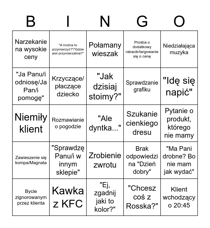 This bingo card has a free space and 24 words: "Sprawdzę Panu/i w innym sklepie", Kawka z KFC, "Jak dzisiaj stoimy?", Bycie zignorowanym przez klienta, Niedziałająca muzyka, Narzekanie na wysokie ceny, "Ja Panu/i odniosę/Ja Pan/i pomogę", "A można to przymierzyć?"/'Gdzie jest przymierzalnia?", Szukanie cienkiego dresu, Zrobienie zwrotu, Sprawdzanie grafiku, Niemiły klient, Brak odpowiedzi na "Dzień dobry", "Ma Pani drobne? Bo nie mam jak wydać", Krzyczące/ płaczące dziecko, "Chcesz coś z Rosska?", Pytanie o produkt, którego nie mamy, Połamany wieszak, "Idę się napić", Rozmawianie o pogodzie, Klient wchodzący o 20:45, Zawieszenie się kompa/Magnata, Prośba o dodatkowy rabacik/targowanie się o cenę and "Ej, zgadnij jaki to kolor?".