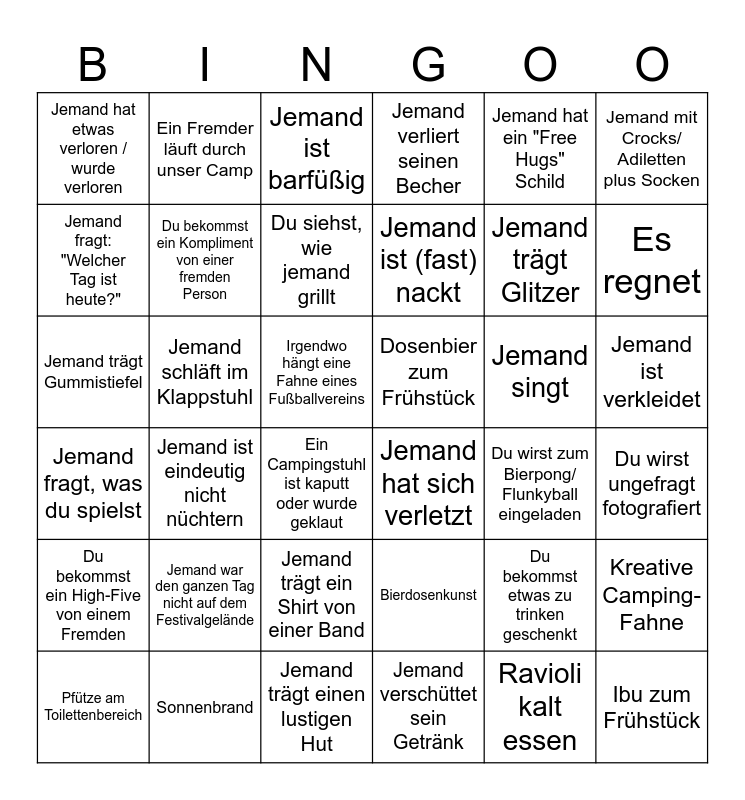This bingo card has 36 words: Jemand fragt, was du spielst, Jemand ist eindeutig nicht nüchtern, Jemand trägt einen lustigen Hut, Jemand ist (fast) nackt, Jemand singt, Jemand ist verkleidet, Jemand hat etwas verloren / wurde verloren, Sonnenbrand, Jemand ist barfüßig, Bierdosenkunst, Jemand trägt Glitzer, Jemand mit Crocks/ Adiletten plus Socken, Du bekommst ein High-Five von einem Fremden, Jemand schläft im Klappstuhl, Du siehst, wie jemand grillt, Jemand verliert seinen Becher, Du bekommst etwas zu trinken geschenkt, Du wirst ungefragt fotografiert, Jemand fragt: "Welcher Tag ist heute?", Du bekommst ein Kompliment von einer fremden Person, Ein Campingstuhl ist kaputt oder wurde geklaut, Jemand hat sich verletzt, Du wirst zum Bierpong/ Flunkyball eingeladen, Kreative Camping-Fahne, Jemand trägt Gummistiefel, Ein Fremder läuft durch unser Camp, Irgendwo hängt eine Fahne eines Fußballvereins, Jemand verschüttet sein Getränk, Jemand hat ein "Free Hugs" Schild, Es regnet, Pfütze am Toilettenbereich, Jemand war den ganzen Tag nicht auf dem Festivalgelände, Jemand trägt ein Shirt von einer Band, Dosenbier zum Frühstück, Ravioli kalt essen and Ibu zum Frühstück.