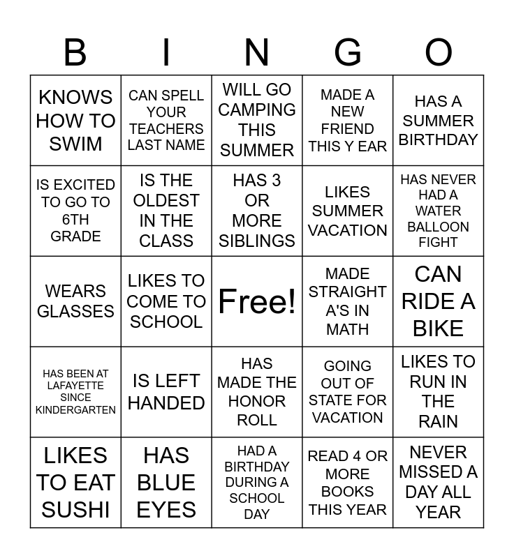This bingo card has a free space and 24 words: IS LEFT HANDED, HAS BLUE EYES, HAS 3 OR MORE SIBLINGS, LIKES TO EAT SUSHI, HAS A SUMMER BIRTHDAY, KNOWS HOW TO SWIM, IS EXCITED TO GO TO 6TH GRADE, CAN SPELL YOUR TEACHERS LAST NAME, MADE STRAIGHT A'S IN MATH, HAS MADE THE HONOR ROLL, LIKES SUMMER VACATION, WEARS GLASSES, GOING OUT OF STATE FOR VACATION, LIKES TO RUN IN THE RAIN, IS THE OLDEST IN THE CLASS, READ 4 OR MORE BOOKS THIS YEAR, CAN RIDE A BIKE, WILL GO CAMPING THIS SUMMER, HAS NEVER HAD A WATER BALLOON FIGHT, LIKES TO COME TO SCHOOL, NEVER MISSED A DAY ALL YEAR, HAS BEEN AT LAFAYETTE SINCE KINDERGARTEN, MADE A NEW FRIEND THIS Y EAR and HAD A BIRTHDAY DURING A SCHOOL DAY.