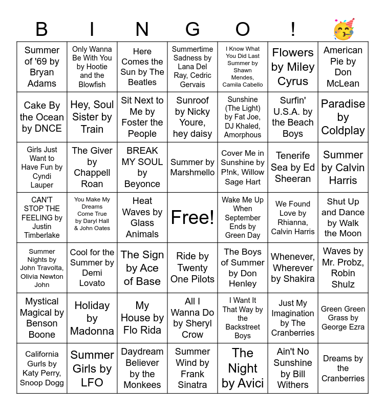 This bingo card has a free space and 55 words: The Night by Avici, Summer by Calvin Harris, Cruel Summer by Taylor Swift, Summer of '69 by Bryan Adams, You Make My Dreams Come True by Daryl Hall & John Oates, Holiday by Madonna, American Pie by Don McLean, Summertime Blues by Alan Jackson, Hey, Soul Sister by Train, My House by Flo Rida, Summertime Sadness by Lana Del Ray, Cedric Gervais, Waves by Mr. Probz, Robin Shulz, Shut Up and Dance by Walk the Moon, We Found Love by Rhianna, Calvin Harris, California Gurls by Katy Perry, Snoop Dogg, Summer Nights by John Travolta, Olivia Newton John, I Know What You Did Last Summer by Shawn Mendes, Camila Cabello, Sunshine (The Light) by Fat Joe, DJ Khaled, Amorphous, Ain't No Sunshine by Bill Withers, Surfin' U.S.A. by the Beach Boys, Paradise by Coldplay, Cool for the Summer by Demi Lovato, Cover Me in Sunshine by P!nk, Willow Sage Hart, Here Comes the Sun by The Beatles, Summer in the City by The Lovin' Spoonful, Cake By the Ocean by DNCE, Heat Waves by Glass Animals, Live While We're Young by One Direction, Girls Just Want to Have Fun by Cyndi Lauper, Tenerife Sea by Ed Sheeran, Our Last Summer from Mama Mia!, Whenever, Wherever by Shakira, Green Green Grass by George Ezra, Summer Girls by LFO, Flowers by Miley Cyrus, Sunroof by Nicky Youre, hey daisy, Mystical Magical by Benson Boone, The Giver by Chappell Roan, Dreams by the Cranberries, The Sign by Ace of Base, Only Wanna Be With You by Hootie and the Blowfish, All I Wanna Do by Sheryl Crow, I Want It That Way by the Backstreet Boys, Rollercoaster by Bleachers, BREAK MY SOUL by Beyonce, CAN'T STOP THE FEELING by Justin Timberlake, Daydream Believer by the Monkees, The Boys of Summer by Don Henley, Wake Me Up When September Ends by Green Day, Sit Next to Me by Foster the People, Ride by Twenty One Pilots, Just My Imagination by The Cranberries, Summer Wind by Frank Sinatra, Summer by Marshmello and Summer by Imagine Dragons.