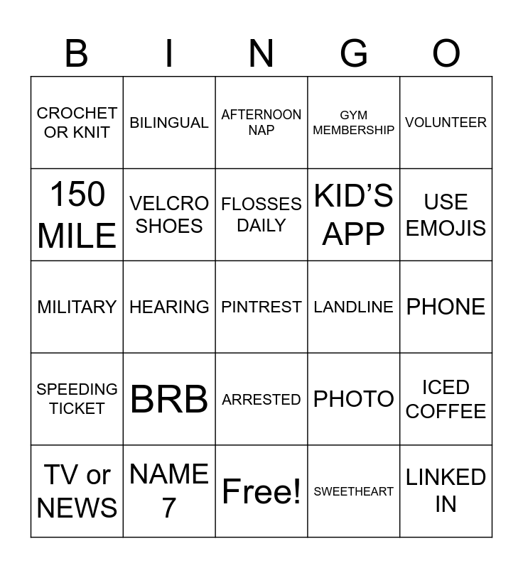 This bingo card has 31 words: Free!, MEDS, HEARING, 30 YRS, CROCHET OR KNIT, AFTERNOON NAP, VELCRO SHOES, PHOTO, LANDLINE, SWEETHEART, PHONE, PINTREST, LINKED IN, SKYDIVING, USE EMOJIS, UBER, ICED COFFEE, BRB, SPEEDING TICKET, ARRESTED, VOLUNTEER, STICKSHIFT, TV or NEWS, BILINGUAL, KID’S APP, 150 MILE, GYM MEMBERSHIP, MILITARY, NAME 7, FLOSSES DAILY and WESTERNS.