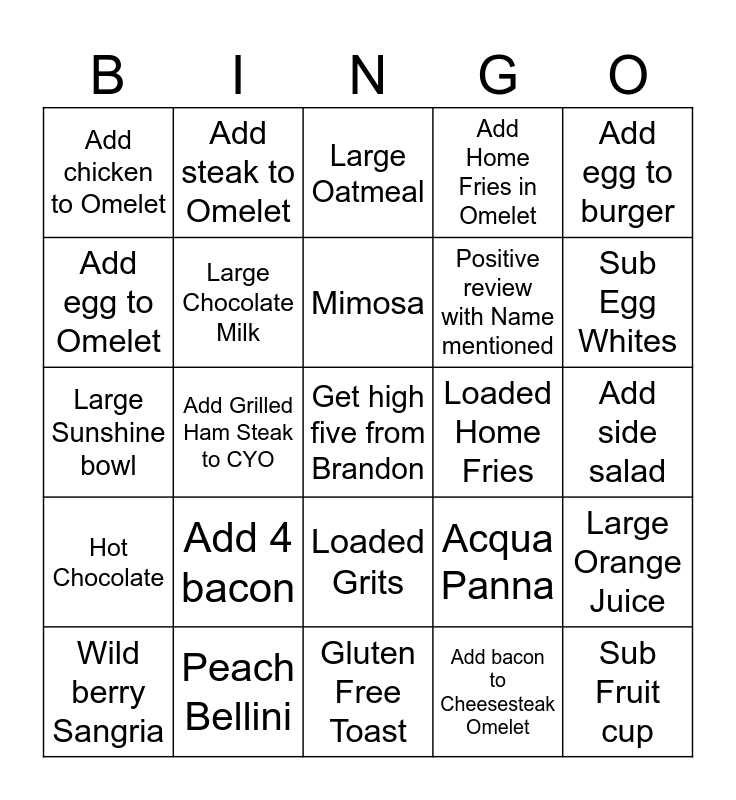 This bingo card has a free space and 24 words: Add 4 bacon, Peach Bellini, Mimosa, Wild berry Sangria, Add egg to burger, Add chicken to Omelet, Add egg to Omelet, Add steak to Omelet, Loaded Home Fries, Loaded Grits, Positive review with Name mentioned, Large Sunshine bowl, Acqua Panna, Large Orange Juice, Large Chocolate Milk, Add bacon to Cheesesteak Omelet, Add side salad, Large Oatmeal, Sub Egg Whites, Add Grilled Ham Steak to CYO, Sub Fruit cup, Hot Chocolate, Add Home Fries in Omelet and Gluten Free Toast.