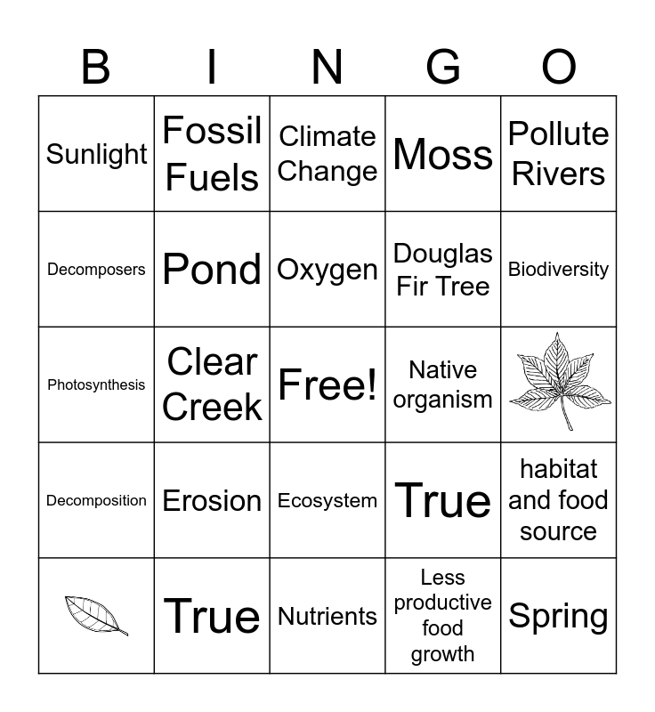 This bingo card has 2 images, a free space and 22 words: Erosion, True, Oxygen, Pollute Rivers, Sunlight, Decomposers, Fossil Fuels, Native organism, Ecosystem, Douglas Fir Tree, Photosynthesis, True, habitat and food source, Pond, Less productive food growth, Climate Change, Biodiversity, Clear Creek, Spring, Decomposition, Moss and Nutrients.