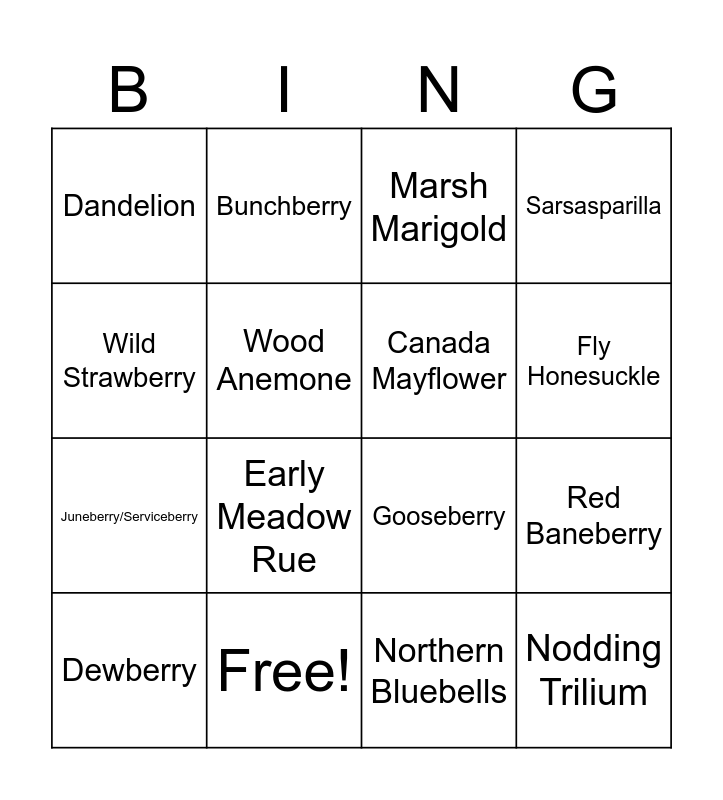 This bingo card has 16 words: Free!, Red Baneberry, Marsh Marigold, Dandelion, Juneberry/Serviceberry, Bunchberry, Gooseberry, Northern Bluebells, Wild Strawberry, Wood Anemone, Dewberry, Sarsasparilla, Early Meadow Rue, Fly Honesuckle, Canada Mayflower and Nodding Trilium.