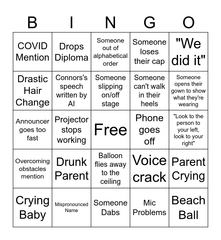 This bingo card has a free space and 24 words: Drunk Parent, Mispronounced Name, Someone slipping on/off stage, Crying Baby, "We did it", COVID Mention, Drastic Hair Change, Drops Diploma, Phone goes off, Balloon flies away to the ceiling, Someone can't walk in their heels, Announcer goes too fast, Voice crack, Parent Crying, Connors's speech written by AI, Mic Problems, "Look to the person to your left, look to your right", Someone out of alphabetical order, Someone opens their gown to show what they're wearing, Projector stops working, Beach Ball, Overcoming obstacles mention, Someone loses their cap and Someone Dabs.