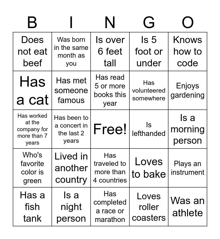 This bingo card has a free space and 24 words: Lived in another country, Is a night person, Has read 5 or more books this year, Has a fish tank, Knows how to code, Does not eat beef, Has a cat, Was born in the same month as you, Is lefthanded, Has traveled to more than 4 countries, Has volunteered somewhere, Has worked at the company for more than 7 years, Loves to bake, Plays an instrument, Has met someone famous, Loves roller coasters, Is a morning person, Is over 6 feet tall, Enjoys gardening, Has been to a concert in the last 2 years, Was an athlete, Who's favorite color is green, Is 5 foot or under and Has completed a race or marathon.