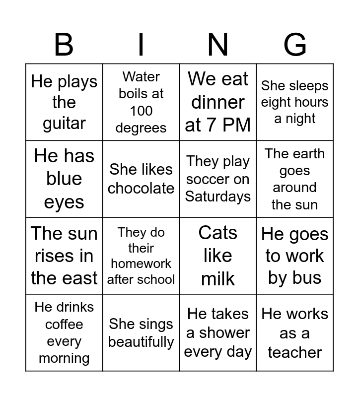 This bingo card has 20 words: He drinks coffee every morning, They watch TV in the evening, We eat dinner at 7 PM, He goes to work by bus, I brush my teeth twice a day, They do their homework after school, He takes a shower every day, She sleeps eight hours a night, The sun rises in the east, Water boils at 100 degrees, Cats like milk, The earth goes around the sun, He plays the guitar, She sings beautifully, They play soccer on Saturdays, He cooks delicious food, He has blue eyes, She likes chocolate, They live in a big house and He works as a teacher.