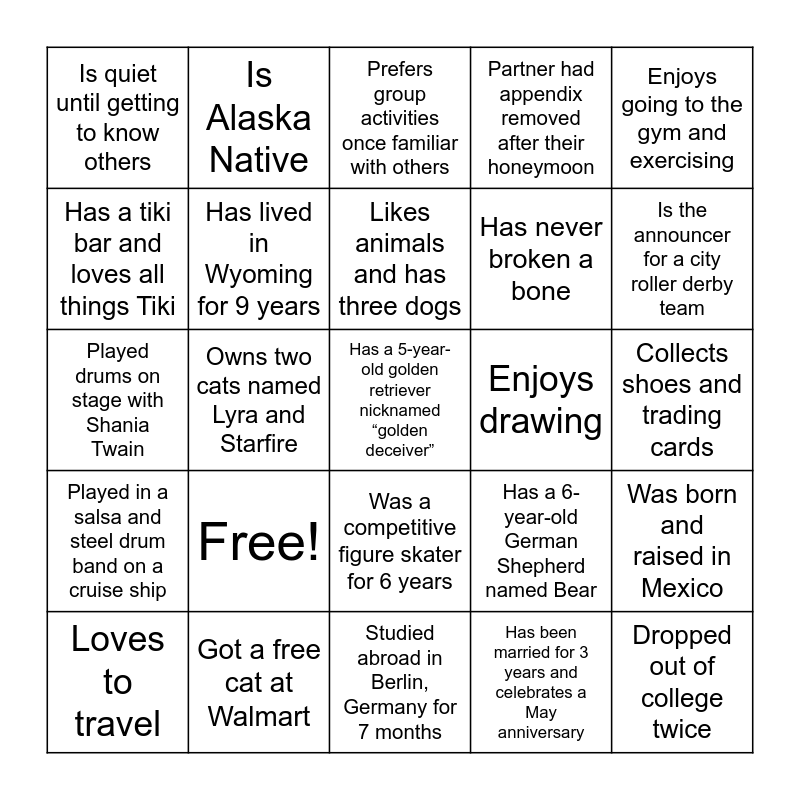 This bingo card has a free space and 25 words: Free!, Studied abroad in Berlin, Germany for 7 months, Likes animals and has three dogs, Loves to travel, Enjoys going to the gym and exercising, Is quiet until getting to know others, Has a tiki bar and loves all things Tiki, Is Alaska Native, Enjoys drawing, Was a competitive figure skater for 6 years, Has never broken a bone, Played drums on stage with Shania Twain, Has a 6-year-old German Shepherd named Bear, Was born and raised in Mexico, Has lived in Wyoming for 9 years, Has moved 18 times, Collects shoes and trading cards, Prefers group activities once familiar with others, Is the announcer for a city roller derby team, Owns two cats named Lyra and Starfire, Dropped out of college twice, Got a free cat at Walmart, Played in a salsa and steel drum band on a cruise ship, Partner had appendix removed after their honeymoon and Has been married for 3 years and celebrates a May anniversary.