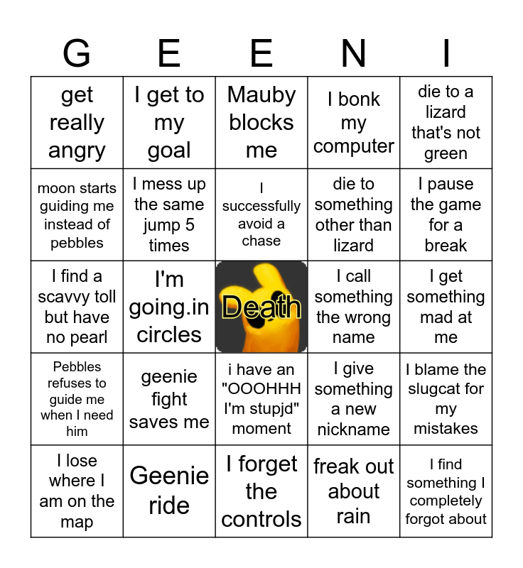 This bingo card has a free space and 30 words: Geenie ride, death by pole plant or dropwig, I'm going.in circles, same den 3 times, get really angry, Mauby blocks me, I mess up the same jump 5 times, i have an "OOOHHH I'm stupjd" moment, I call something the wrong name, I forget the controls, I get something mad at me, I find something I completely forgot about, freak out about rain, get mad at pebbles, I pause the game for a break, I starve myself, I give something a new nickname, Pebbles refuses to guide me when I need him, geenie fight saves me, die to a lizard that's not green, I find a scavvy toll but have no pearl, I find a pearl, I get to my goal, die to something other than lizard, moon starts guiding me instead of pebbles, I bonk my computer, I blame the slugcat for my mistakes, I lose where I am on the map, I successfully avoid a chase and my map is proven bad.