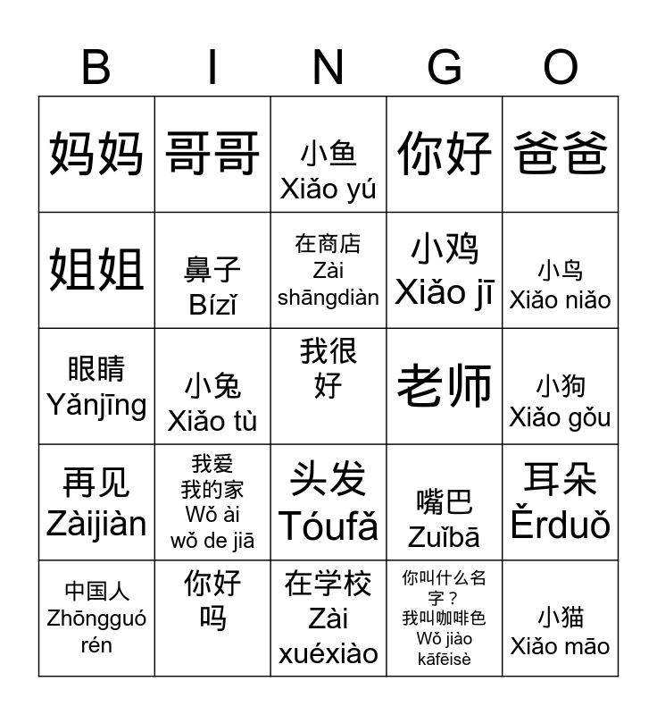 This bingo card has 25 words: 我爱 我的家 Wǒ ài wǒ de jiā, 在学校 Zài xuéxiào, 在商店 Zài shāngdiàn, 中国人 Zhōngguó rén, 爸爸, 妈妈, 姐姐, 哥哥, 老师, 头发 Tóufǎ, 小鸡 Xiǎo jī, 眼睛 Yǎnjīng, 嘴巴 Zuǐbā, 耳朵 Ěrduǒ, 鼻子 Bízǐ, 小猫 Xiǎo māo, 小狗 Xiǎo gǒu, 小鱼 Xiǎo yú, 小鸟 Xiǎo niǎo, 小兔 Xiǎo tù, 我很好, 你好吗, 再见 Zàijiàn, 你好 and 你叫什么名字? 我叫咖啡色 Wǒ jiào kāfēisè.