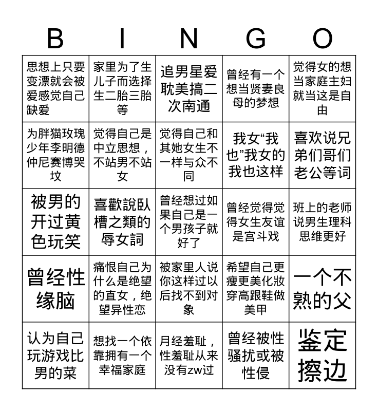 This bingo card has a free space and 24 words: 痛恨自己为什么是绝望的直女,绝望异性恋, 想找一个依靠拥有一个幸福家庭, 觉得自己和其她女生不一样与众不同, 认为自己玩游戏比男的菜, 觉得女的想当家庭主妇就当这是自由, 思想上只要变漂就会被爱感觉自己缺爱, 为胖猫玫瑰少年李明德仲尼赛博哭坟, 家里为了生儿子而选择生二胎三胎等, 曾经觉得觉得女生友谊是宫斗戏, 被家里人说你这样过以后找不到对象, 我女“我也”我女的我也这样, 被男的开过黄色玩笑, 希望自己更瘦更美化妝穿高跟鞋做美甲, 一个不熟的父, 觉得自己是中立思想,不站男不站女, 曾经被性骚扰或被性侵, 班上的老师说男生理科思维更好, 追男星爱耽美搞二次南通, 喜欢说兄弟们哥们老公等词, 喜歡說臥槽之類的辱女詞, 鉴定擦边, 曾经性缘脑, 曾经有一个想当贤妻良母的梦想 and 月经羞耻,性羞耻从来没有zw过.