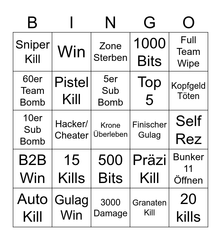 This bingo card has a free space and 24 words: 15 Kills, Gulag Win, 5er Sub Bomb, Auto Kill, Full Team Wipe, Sniper Kill, 60er Team Bomb, Win, Finischer Gulag, 500 Bits, Top 5, 10er Sub Bomb, Präzi Kill, Bunker 11 Öffnen, Pistel Kill, Granaten Kill, Self Rez, Zone Sterben, Kopfgeld Töten, Hacker/ Cheater, 20 kills, B2B Win, 1000 Bits and 3000 Damage.