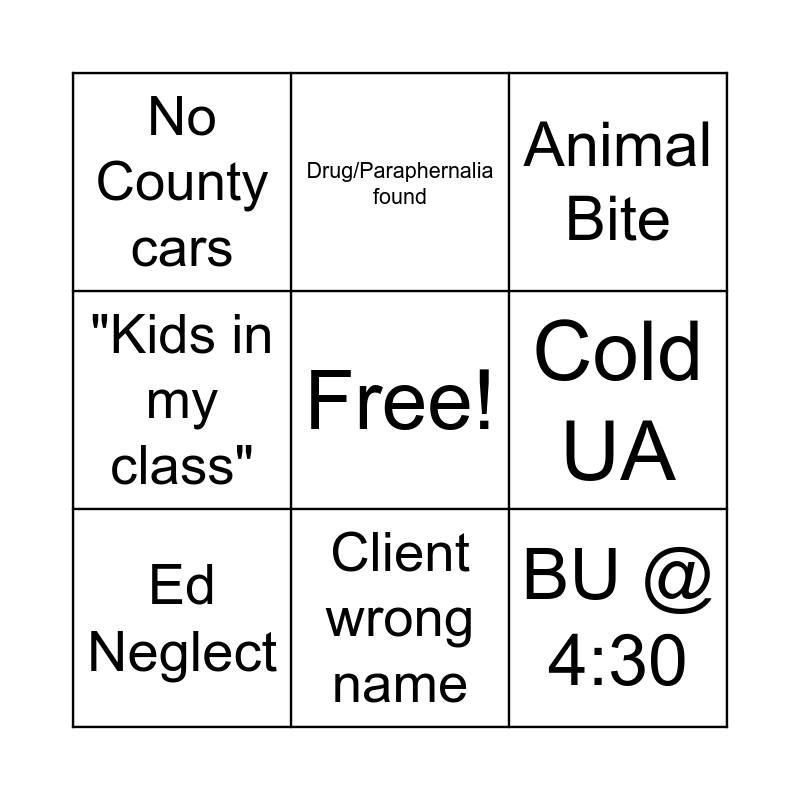 This bingo card has a free space and 8 words: Cold UA, Animal Bite, Drug/Paraphernalia found, Ed Neglect, No County cars, BU @ 4:30, "Kids in my class" and Client wrong name.