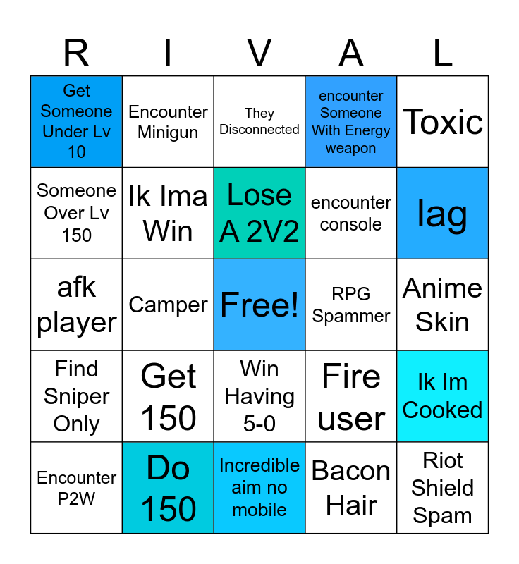 This bingo card has a free space and 24 words: Get 150, Do 150, Lose A 2V2, Encounter P2W, Toxic, Get Someone Under Lv 10, Someone Over Lv 150, Encounter Minigun, RPG Spammer, Win Having 5-0, encounter console, afk player, Fire user, Ik Im Cooked, Ik Ima Win, Bacon Hair, Anime Skin, They Disconnected, lag, Camper, Riot Shield Spam, Find Sniper Only, encounter Someone With Energy weapon and Incredible aim no mobile.