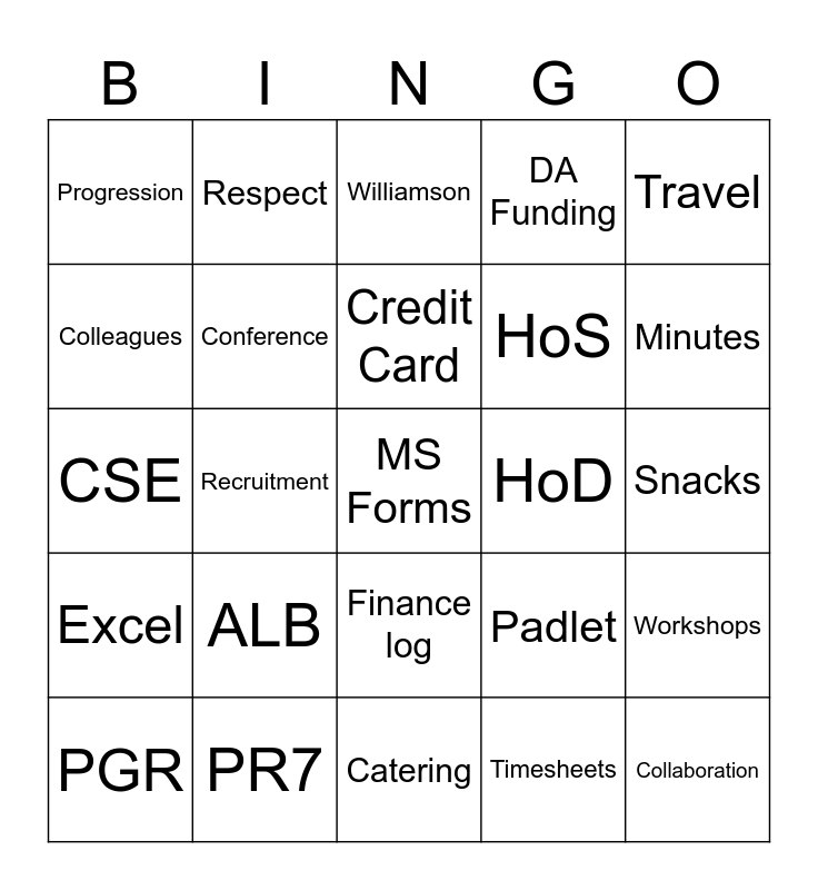 This bingo card has a free space and 24 words: ALB, PR7, Credit Card, PGR, Travel, Progression, Colleagues, Respect, HoD, Finance log, HoS, CSE, Padlet, Workshops, Conference, Timesheets, Snacks, Williamson, Minutes, Recruitment, Collaboration, Excel, DA Funding and Catering.