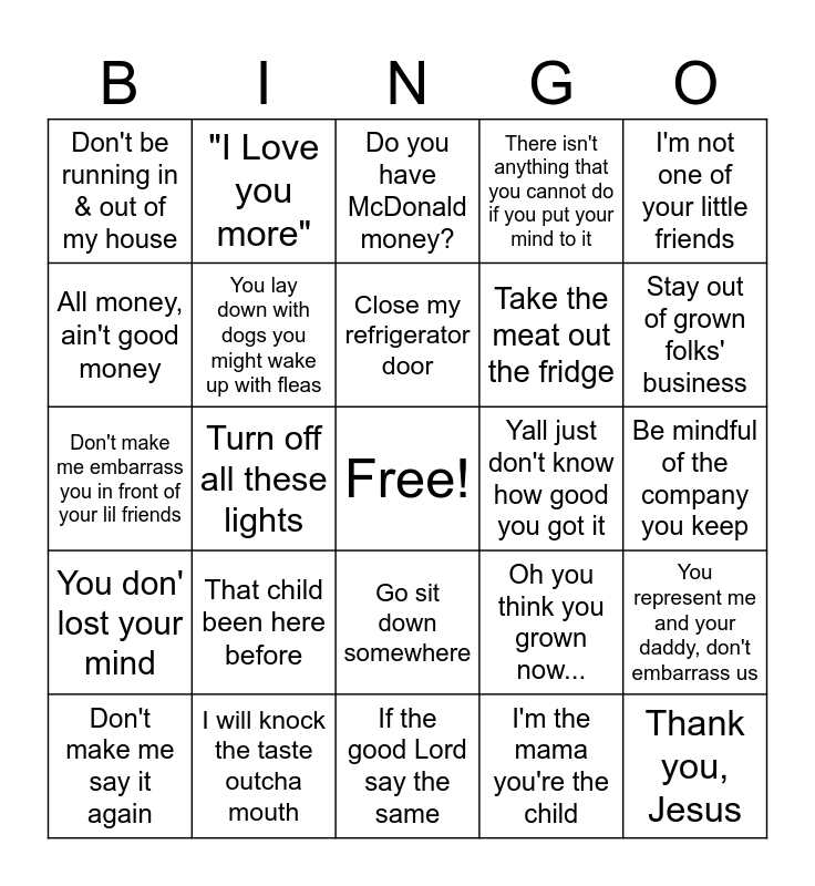 This bingo card has a free space and 29 words: Don't make me say it again, What bills do you pay in this house?, Turn off all these lights, God is good, Don't be running in & out of my house, Do you have McDonald money?, You lay down with dogs you might wake up with fleas, That child been here before, Yall just don't know how good you got it, I will knock the taste outcha mouth, Be mindful of the company you keep, Thank you, Jesus, If the good Lord say the same, I'm the mama you're the child, Stay out of grown folks' business, Now that's too much sugar for a nickel, Go sit down somewhere, You don' lost your mind, I'm not one of your little friends, Don't make me embarrass you in front of your lil friends, Oh you think you grown now..., You will always be my baby, Take the meat out the fridge, All money, ain't good money, There isn't anything that you cannot do if you put your mind to it, "I Love you more", You represent me and your daddy, don't embarrass us, Close my refrigerator door and Jesus take to wheel.