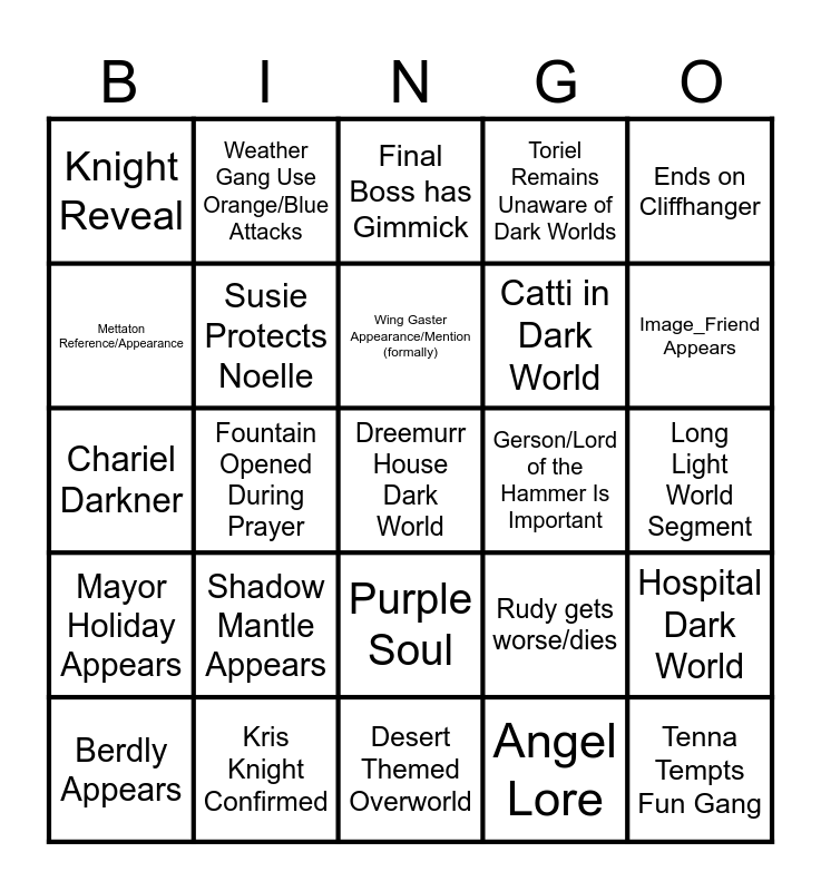 This bingo card has a free space and 51 words: Rouxls Kaard Returns, Tenna Tempts Fun Gang, Not Visiting Castle Town in Chapter 2 Changes Story, Desert Themed Overworld, Shadow Mantle Appears, Napstablook In Dark World, Weather Gang Use Orange/Blue Attacks, Woody Theory is Real, Mettaton Reference/Appearance, Lancer is relevant, Susie Protects Noelle, Toriel Remains Unaware of Dark Worlds, Hospital Dark World, Rudy gets worse/dies, Church Dark World, The Bunker Appears, Wing Gaster Appearance/Mention (formally), Gerson/Lord of the Hammer Is Important, Papyrus Hangout, Ends on Cliffhanger, Fountain Opened During Prayer, Angel Lore, Knight Reveal, Catti in Dark World, Jockington in Dark World, Susie has a tail, Image_Friend Appears, Image_Friend is a Cat, Berdly Appears, Final Boss has Gimmick, Spamton Appears/Referenced, Mike Appears/Referenced, Kris is not Chara/Frisk, Nighttime Changes Dark World, Toriel and Ralsei Meet, Kris Knight Confirmed, Kris Knight Debunked, Gaster Cliffhanger, We see Chapter 5 Fountain Made, Noelle's House Visit, Long Light World Segment, Mayor Holiday Appears, Asgore in Dark World, Flower Secret Boss, Console/Controller Secret Boss, How to Draw Dragons Appears, Chariel Darkner, Pluey, Tenna Dies, Purple Soul and Green Soul.