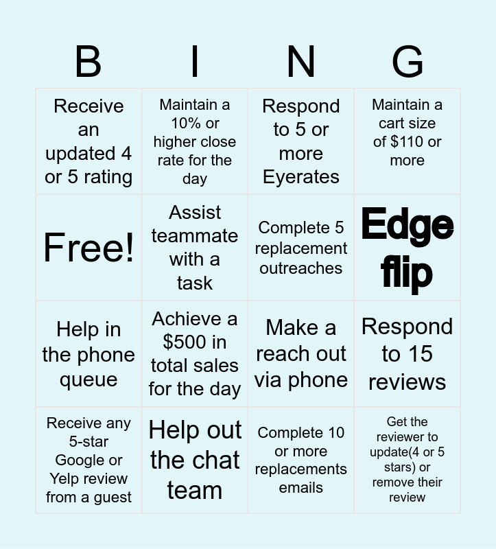 This bingo card has 16 words: Help out the chat team, Respond to 15 reviews, Respond to 5 or more Eyerates, Receive an updated 4 or 5 rating, Help in the phone queue, Maintain a 10% or higher close rate for the day, Make a reach out via phone, Complete 10 or more replacements emails, Free!, Assist teammate with a task, Receive any 5-star Google or Yelp review from a guest, Maintain a cart size of $110 or more, Achieve a $500 in total sales for the day, Edge flip, Complete 5 replacement outreaches and Get the reviewer to update(4 or 5 stars) or remove their review.