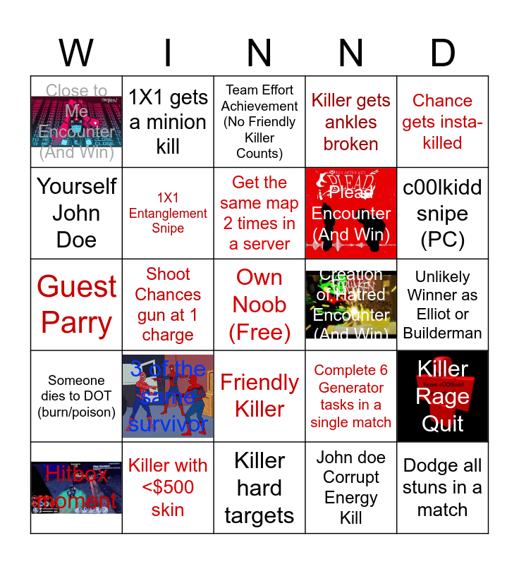 This bingo card has 6 images, a free space and 24 words: 3 of the same survivor, Killer with <$500 skin, Get the same map 2 times in a server, Hitbox moment, Chance gets insta-killed, Close to Me Encounter (And Win), Yourself John Doe, 1X1 gets a minion kill, Creation of Hatred Encounter (And Win), Friendly Killer, Plead Encounter (And Win), Guest Parry, Complete 6 Generator tasks in a single match, Killer Rage Quit, 1X1 Entanglement Snipe, John doe Corrupt Energy Kill, Unlikely Winner as Elliot or Builderman, Team Effort Achievement (No Friendly Killer Counts), c00lkidd snipe (PC), Shoot Chances gun at 1 charge, Dodge all stuns in a match, Someone dies to DOT (burn/poison), Killer gets ankles broken and Killer hard targets.