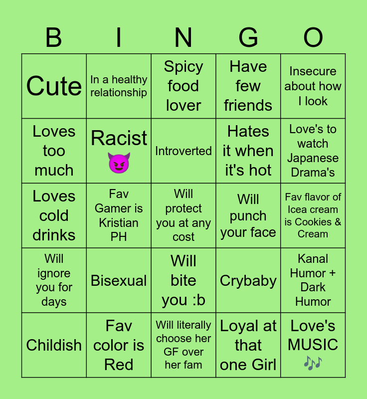 This bingo card has a free space and 24 words: Bisexual, Fav color is Red, Introverted, Childish, Insecure about how I look, Cute, Loves too much, In a healthy relationship, Will punch your face, Will bite you :b, Hates it when it's hot, Loves cold drinks, Crybaby, Kanal Humor + Dark Humor, Racist 😈, Loyal at that one Girl, Fav flavor of Icea cream is Cookies & Cream, Spicy food lover, Love's to watch Japanese Drama's, Fav Gamer is Kristian PH, Love's MUSIC 🎶, Will ignore you for days, Have few friends and Will literally choose her GF over her fam.