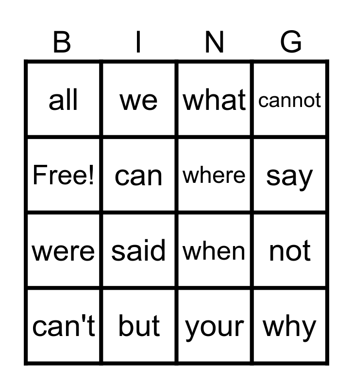 This bingo card has 16 words: but, not, what, all, were, we, when, your, Free!, can, can't, cannot, said, say, where and why.