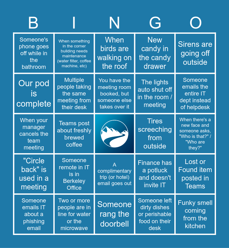 This bingo card has a free space and 47 words: Both dishwashers are full, Funky smell coming from the kitchen, There's someone yelling on the street, Someone rang the doorbell, Someone remote in IT is in Berkeley Office, Someone's headphones is not connected to their laptop when they joined their meeting, When something in the corner building needs maintenance (water filter, coffee machine, etc), P&C is giving a tour in the corner building for new hires, Our pod is complete, Think Tank East door is not closed during a meeting, Multiple people taking the same meeting from their desk, New candy in the candy drawer, Lost or Found item posted in Teams, Finance has a potluck and doesn't invite IT, Someone sneezes at least two times in a row, Think Tank East is not booked for more than 2 hours (Not on a Wednesday and between the hours of 9 to 5), You have the meeting room booked, but someone else takes over it, Tires screeching from outside, Music is blasting outside, Sirens are going off outside, Teams post about freshly brewed coffee, Someone left dirty dishes or perishable food on their desk, Someone's phone goes off while in the bathroom, The lights auto shut off in the room / meeting, Tom does a Reply All to an email, Someone emails the entire IT dept instead of helpdesk, Someone emails IT about a phishing email, Softrip times out, A complimentary trip (or hotel) email goes out, "Circle back" is used in a meeting, "Close the loop" is used in a meeting, Server maintenance email goes out, Someone is getting a teams call (ringtone is playing through their speakers), Someone (not playing bingo made a comment on the building temperature), Music starts playing from someone's laptop or phone, Two or more people are in line for water or the microwave, When there's a new face and someone asks, "Who is that?" / "Who are they?", Someone messages on Teams while they're on vacation, Someone (not yourself) left their computer on, When there is a post about correcting bad behavior, When your computer decides to restart all of a sudden, When birds are walking on the roof, When your manager cancels the team meeting, When your manager cancels your 1:1, When someone uses "Correct me if I'm wrong" in a meeting (or some variant), Someone from IT makes a business trip (Not Berkeley) and When people from the main building uses the corner building courtyard for an event.