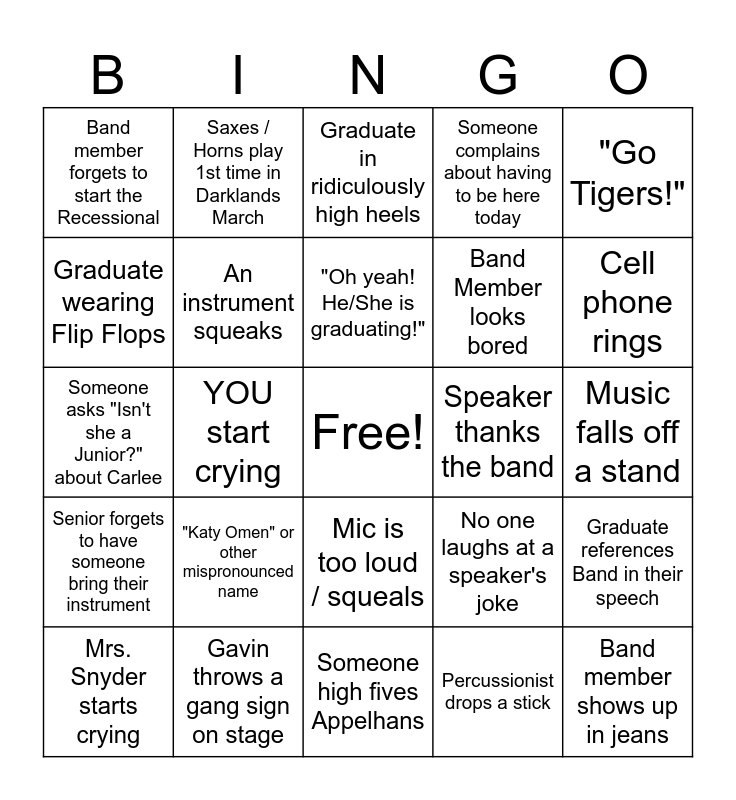 This bingo card has a free space and 39 words: Trumpets miss the repeat in Pomp, Someone mentions COVID in their speech, Someone mentions Band Camp, An instrument squeaks, Mrs. Snyder starts crying, Mic is too loud / squeals, "Oh yeah! He/She is graduating!", Someone is graduating from YOUR section, "Go Tigers!", Senior forgets to have someone bring their instrument, YOU start crying, Someone complains about having to be here today, Band member shows up in jeans, Music falls off a stand, Speaker thanks the band, "Katy Omen" or other mispronounced name, Someone brings their D.S., Band member forgets to start the Recessional, Faculty / Staff Member yawning, No one laughs at a speaker's joke, Graduate wearing Flip Flops, Someone high fives Appelhans, Band Member looks bored, Cell phone rings, Someone's Mom/Dad crying, Family comes in late, Graduate trips, Someone wearing sunglasses inside, Someone asks which song we're playing, Saxes / Horns play 1st time in Darklands March, Mrs. Snyder drops her baton, Band Member in shorts, Graduate in ridiculously high heels, Gavin throws a gang sign on stage, Percussionist drops a stick, Someone breaks / chips a reed, Graduate references Band in their speech, Someone asks "Isn't she a Junior?" about Carlee and Graduate playing games on their phone.