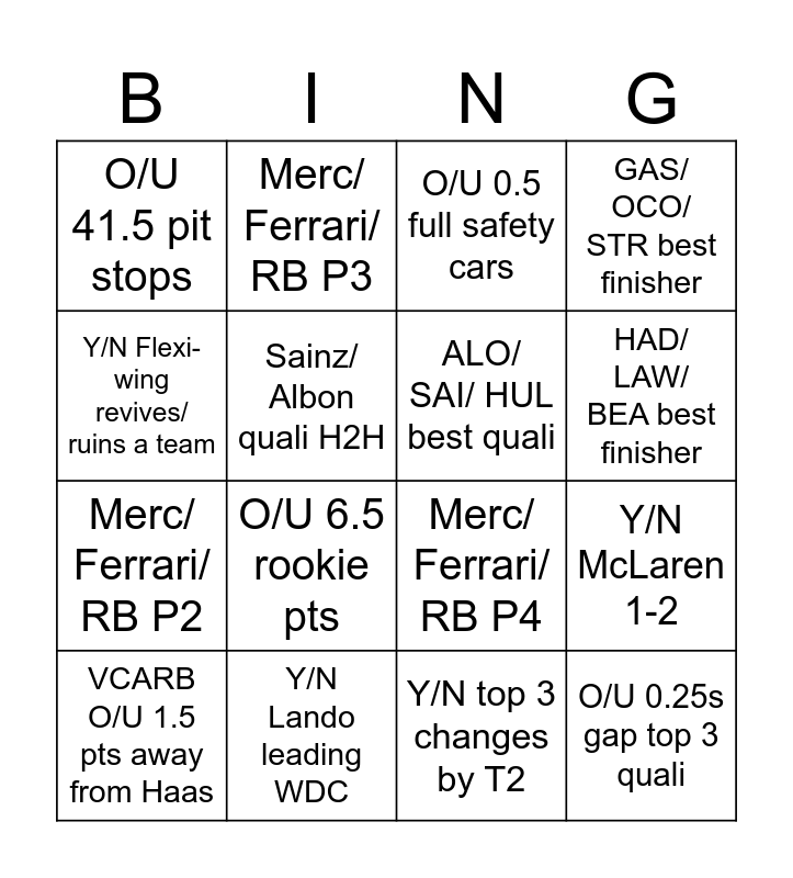 This bingo card has 16 words: Y/N Lando leading WDC, Y/N McLaren 1-2, O/U 0.5 full safety cars, O/U 41.5 pit stops, Merc/ Ferrari/ RB P2, Merc/ Ferrari/ RB P3, Merc/ Ferrari/ RB P4, Y/N top 3 changes by T2, Y/N Flexi-wing revives/ ruins a team, Sainz/ Albon quali H2H, VCARB O/U 1.5 pts away from Haas, GAS/ OCO/ STR best finisher, O/U 6.5 rookie pts, HAD/ LAW/ BEA best finisher, ALO/ SAI/ HUL best quali and O/U 0.25s gap top 3 quali.
