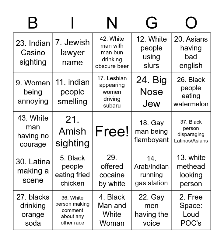 This bingo card has a free space and 46 words: 1. Indian People being rude, 2. Free Space: Loud POC's, 3. Asians using selfie stick, 4. Black Man and White Woman, 5. Black people eating fried chicken, 6. Hispanics working construction, 7. Jewish lawyer name, 8. Asians driving badly, 9. Women being annoying, 10. White people not paying attention to sidewalk, 11. indian people smelling, 12. White people using slurs, 13. white methead looking person, 14. Arab/Indian running gas station, 15. Non-English speaking tech support, 16. white men with tattoos and earrings, 17. Lesbian appearing women driving subaru, 18. Gay man being flamboyant, 19. Black kids not listening to parent, 20. Asians having bad english, 21. Amish sighting, 22. Gay men having the voice, 23. Indian Casino sighting, 24. Big Nose Jew, 25. Muslim wearing hijab, 26. Black people eating watermelon, 27. blacks drinking orange soda, 28. Offered crack by black, 29. offered cocaine by white, 30. Latina making a scene, 31. Latinos solely using Spanish, 32. White person biking in grossly inappropriate spot, 33. Arab women not showing face, 34. Black/Mexican smells heavily of marijuana, 35. White man wearing chain without any actual jewlery, 36. White person making comment about any other race, 37. Black person disparaging Latinos/Asians, 38. White guy trying to be black, 39. White woman making reference to her dog, 40. latinos getting aggressive for little to no reason, 41. white people disliking flavor, 42. White man with man bun drinking obscure beer, 43. White man having no courage, 44. White women being ignorant, 45. Any mention of stocks or crpyto currency by younger white man and 46. Trump people spotting.