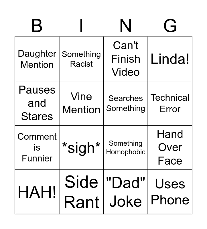 This bingo card has 16 words: Side Rant, Hand Over Face, Can't Finish Video, Daughter Mention, Comment is Funnier, Something Racist, Something Homophobic, "Dad" Joke, Pauses and Stares, Vine Mention, HAH!, Linda!, *sigh*, Technical Error, Searches Something and Uses Phone.