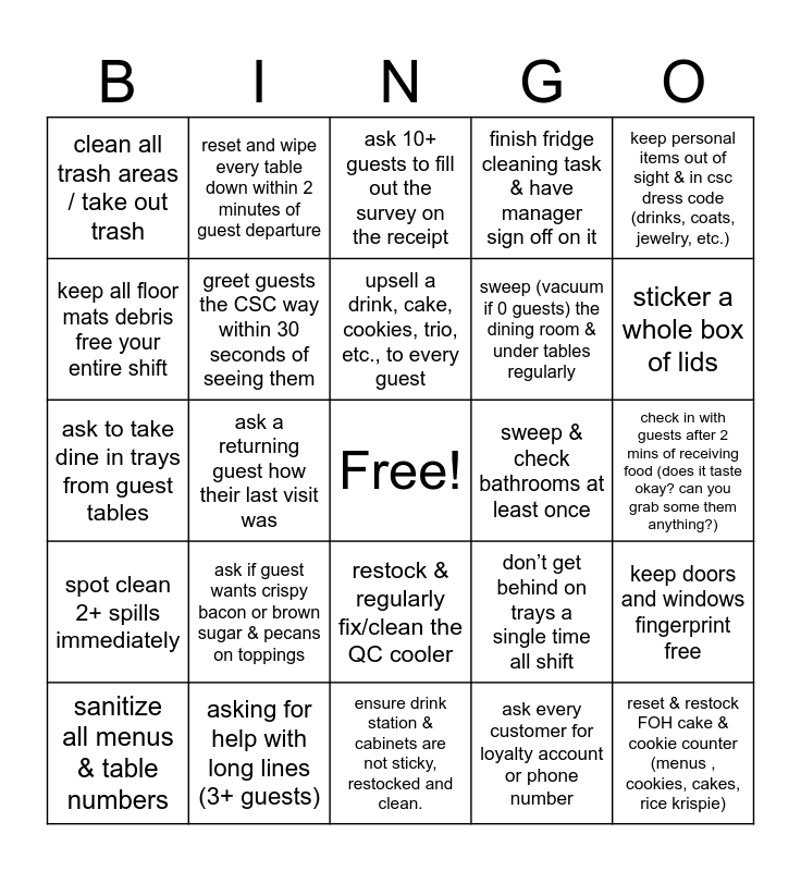 This bingo card has a free space and 24 words: ask if guest wants crispy bacon or brown sugar & pecans on toppings, asking for help with long lines (3+ guests), upsell a drink, cake, cookies, trio, etc., to every guest, sanitize all menus & table numbers, keep personal items out of sight & in csc dress code (drinks, coats, jewelry, etc.), clean all trash areas / take out trash, keep all floor mats debris free your entire shift, reset and wipe every table down within 2 minutes of guest departure, sweep & check bathrooms at least once, restock & regularly fix/clean the QC cooler, sweep (vacuum if 0 guests) the dining room & under tables regularly, ask to take dine in trays from guest tables, don’t get behind on trays a single time all shift, keep doors and windows fingerprint free, greet guests the CSC way within 30 seconds of seeing them, ask every customer for loyalty account or phone number, check in with guests after 2 mins of receiving food (does it taste okay? can you grab some them anything?), ask 10+ guests to fill out the survey on the receipt, sticker a whole box of lids, ask a returning guest how their last visit was, reset & restock FOH cake & cookie counter (menus , cookies, cakes, rice krispie), spot clean 2+ spills immediately, finish fridge cleaning task & have manager sign off on it and ensure drink station & cabinets are not sticky, restocked and clean..