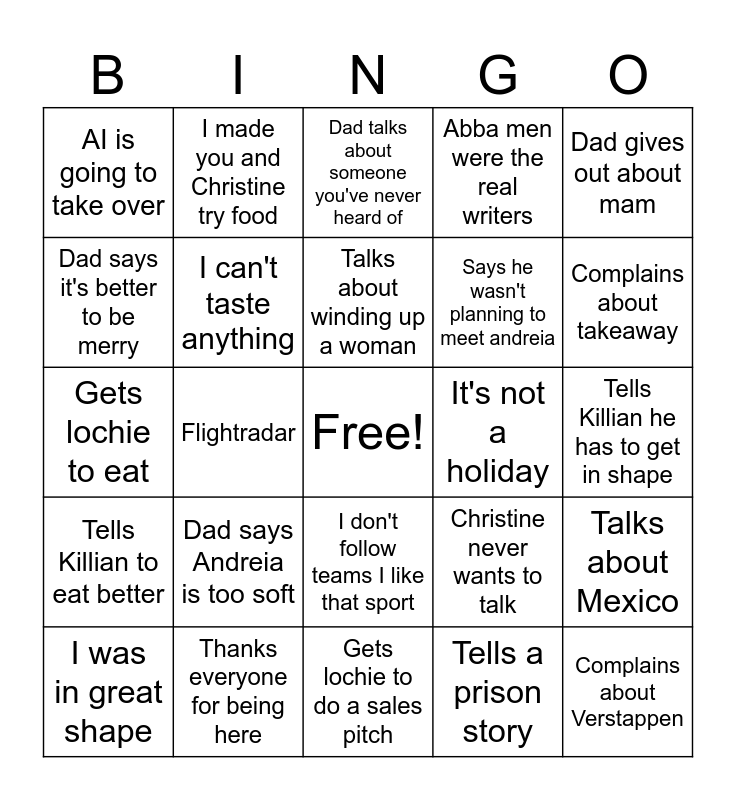This bingo card has a free space and 24 words: Dad says Andreia is too soft, Thanks everyone for being here, Talks about winding up a woman, I was in great shape, Dad gives out about mam, AI is going to take over, Dad says it's better to be merry, I made you and Christine try food, It's not a holiday, I don't follow teams I like that sport, Says he wasn't planning to meet andreia, Gets lochie to eat, Christine never wants to talk, Talks about Mexico, I can't taste anything, Tells a prison story, Tells Killian he has to get in shape, Dad talks about someone you've never heard of, Complains about takeaway, Flightradar, Complains about Verstappen, Tells Killian to eat better, Abba men were the real writers and Gets lochie to do a sales pitch.